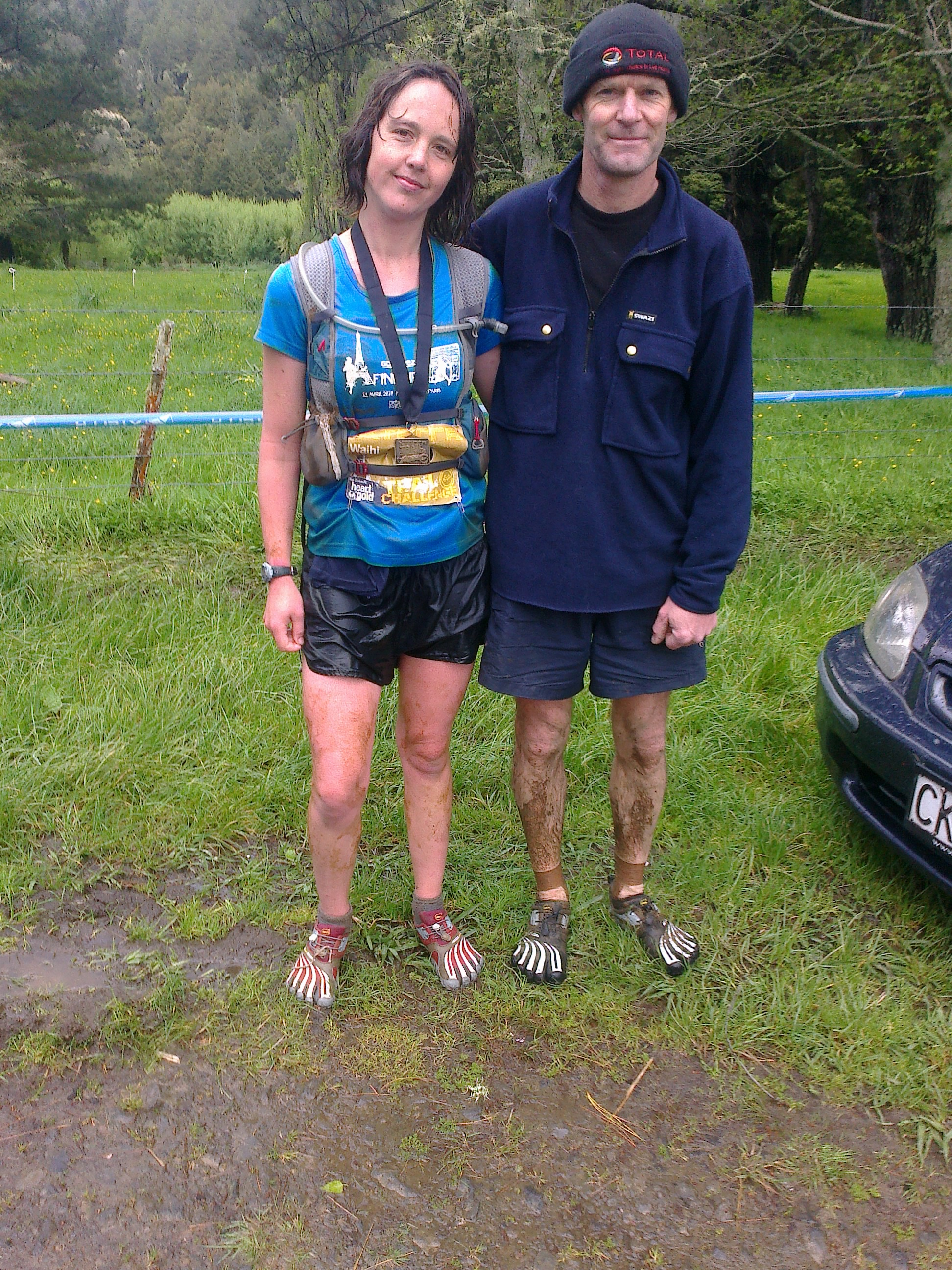 Post-script: You’d think I would have learned something, but precisely one week later I am running on a steeper downhill, in worse mud, wearing my road fivefingers (Bikilas). Good one Dawn! This all comes about via a chance meeting with Duncan from Tauranga at a family wedding in the Hokianga. (Password: “Yeah, I like long distances”. His countersign: “Do you know Kerry Suter?”) Next morning we hit the hills. You can tell Duncan’s a runner because he has to have a crack at the anecdotal Fastest Known Time on the steep section, temporarily handing over the excess weight of his backpack. We tortoise up and find him snoozing at the top, and then have a splendid splash around for a couple of hours through the bush amid fog and wind and rain. Anyway, the moral of the story is: enjoy mud. Glorious.