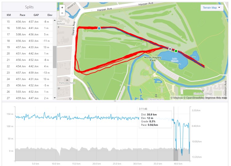 It was precisely three hours and twelve minutes into the race, bang on the 39km mark. The Christchurch day was clear and warm. The pace was on track, averaging 5 minute ks as planned. A lap earlier I’d taken the lead for the first time, although all three of us in the women’s race seemed well-matched, staying close and steady throughout. Nutrition was working. I’d thoroughly enjoyed running with Wayne Botha for a while as he completed his pre-Comrades tune-up.