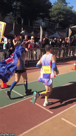 The hours counted down – too, too slowly, but it helped a lot to focus on the goal of breaking the 200k mark, and attacking that in bite-sized chunks, one tottering jog step at a time. It became more and more likely to happen, and then both Fi and I made it. ‘Come with me!’ she called as the crowd went wild heading into the last 10 minutes. My calves were shot, so I waved her and Wayne on. Cue the much awaited flag-run (‘run’ is maybe a generous term).
